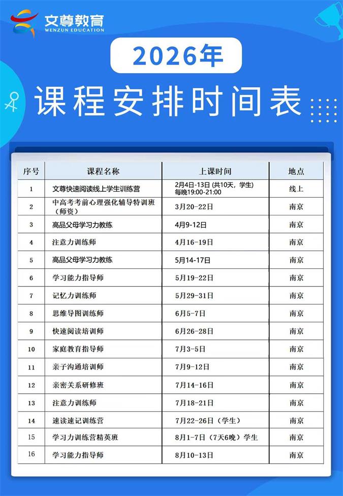 2026文尊教育课程安排时间表2026/1/13 15:21:09 来源:南京 作者:中国学习能力研究院