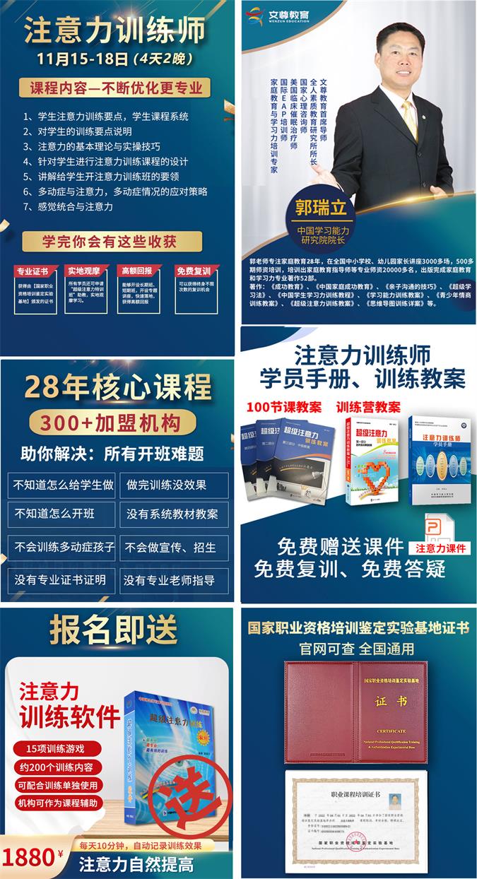 注意力训练一定要用科学的方法。文尊教育郭瑞立教授团队19年来,在对学生进行注意力实际培训和指导基础上,提炼出来的一套系统的注意力训练师课程,既有专业的理论,又有具体的训练方法,具有极强的操作性。 报到时间:2025年11月14日 上课时间:2025年11月15-18日 ![]() ![]() ![]() ![]() ![]() 授课导师 ![]() ![]() ![]() ![]() 咨询、报名、合作 欢迎加我微信 ![]() 关于注意力的更多精彩内容,我们在以后的讲解中还会给大家分享更多,请同学们持续关注文尊教育。 |