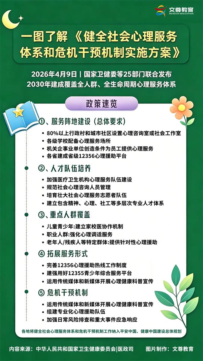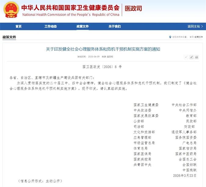 2026年4月9日,国家卫生健康委、中央社会工作部、中央政法委等25个部门联合发布了一份重要文件——《健全社会心理服务体系和危机干预机制实施方案》。