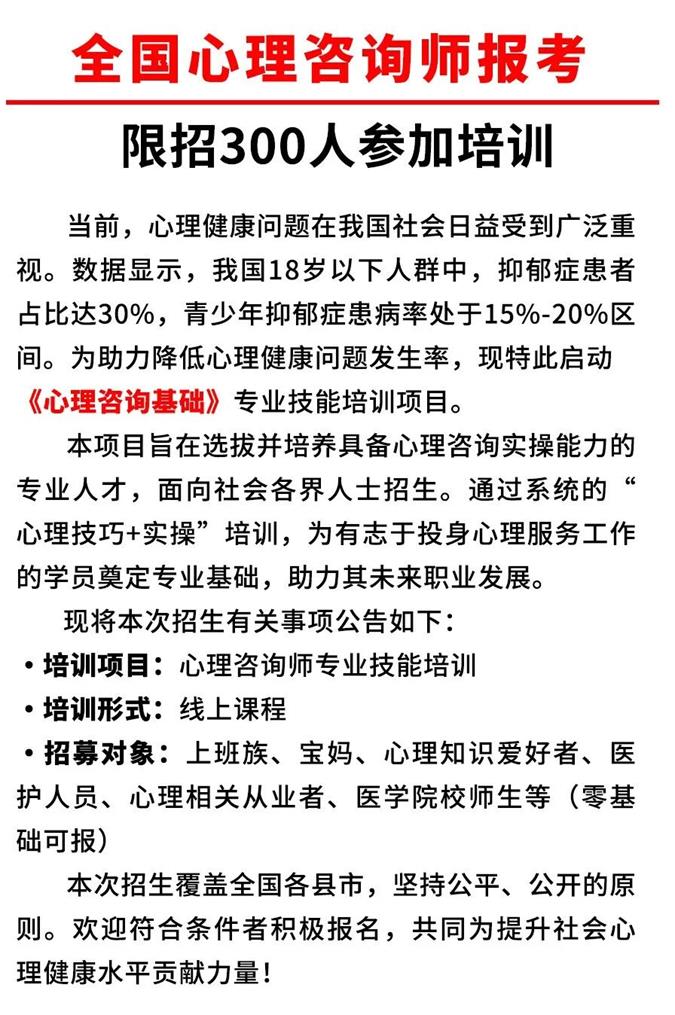 ![]() ![]() ![]() 学习收益 1、轻松处理家庭/子女关系 关于考试 ☑考试时间:每年双月,学员须提前申报和学习。 ☑考试内容:考试科目为选择题、判断题。满分100分,60分及格考过, 报考对象 1、普通大专院校及中小学教师。 2、公安系统、监狱系统、消防系统、安检系统边检站工作人员等。 3、工会、妇联、共青团及相关事业单位工作人员。 4、企业咨询和人力资源管理人员。 5、独立心理咨询工作者,社会心理咨询机构从业人员。 6、社会家庭教育机构,儿童辅导培训机构,青少年活动中心从业人员等。 7、社区服务中心,家政服务机构,家庭保健服务机构从业人员等。 8、医护人员、医学院校等相关人员。 9、上班族、宝妈、心理知识爱好者。 咨询、报名、合作 欢迎加我微信
