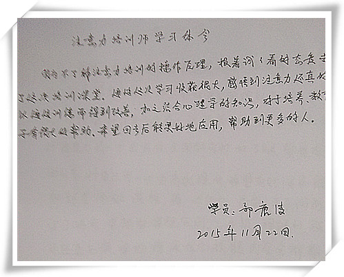 4.郭老师系统的知识结构,和扎实的理论基础,给我很多思考,自己拥有5年的心里学习实践经验,心得和培训师的职业经验,去做一项很据和理念。 5.学习是为了运用和实践,不落实行动的学习时白忙活,回去后立即行动。 吴洁 2015.11.22 注意力学习感悟 此次南京之行,最大的收获在于明白了注意力操作的理论依据,以前也学过曾祥波老师和聂老师的注意力培训,回来后来时普遍心理都存在怀疑,就这样不停地玩游戏真的能提高学生的注意力吗? 姚鹏 2015.11.22 |