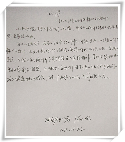 学习感悟 带着满满地期待参加这次的学习,到快结束的时候感觉真的不虚此行。之前也了解了很多有关注意力方面的内容,注意力不集中训练方法。参加过网络和地面的学习。 ![]() 非常感谢郭老师和各位工作人员,在此表达我深深真挚的感恩! 河南新乡 毛瑞易 2015.11.22 听课感悟 2015年最大的一次学习计划就在这金色的11月份开始实现了! 无锡到南京1个小时就到了。来到南大走进教室见到郭教授心情还是很激动的,我终于成为郭瑞立老师的学生了! ![]() 锻炼孩子的注意力的方法其中融入的内容是非常多的,身体、心理、大脑、视觉、听觉、嗅觉、味觉、触觉的部分作为训练的通道,这些通道的练习又要通过游戏的形式体现在课堂上,同学们的参与都非常积极,课堂气氛非常热烈,每次到了下课还是觉得没有够...... 这5天的课堂很丰富,很充实,让我对注意力课程有了新的认知,收获很大同时也收获了很多的友谊! 无锡 杨晓春 2015.11.22 心得——参加《注意力训练师认证培训》 从长沙踏上南京火车那一刻的犹豫,到今天的培训结束后的沉重责任感一直萦绕心头。 ![]() 自从儿子出生后,我参加了各类的培训班,唯独这次的《注意力训练师》的培训,让我对亲子培训的项目有了更清晰地认识以及一套理论系统,在今后亲子培训中这套课程可以直接操作,解决去帮助更多家庭的困惑,让湖南的家长们用科学的方法去引导我们孩子健康地成长,做一个身体与心灵共同成长的人。 湖南省长沙市 张晓凤 2015.11.22 |